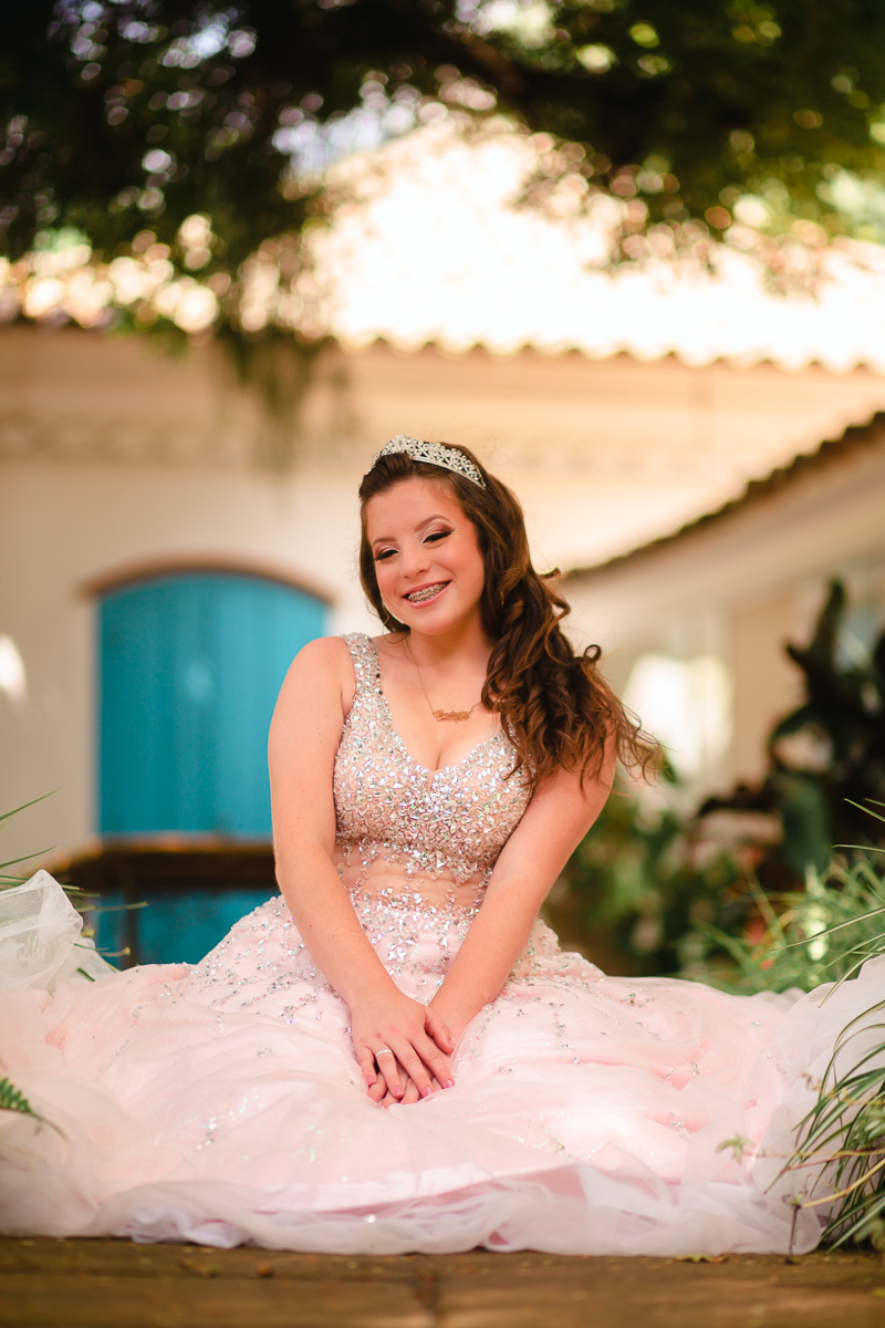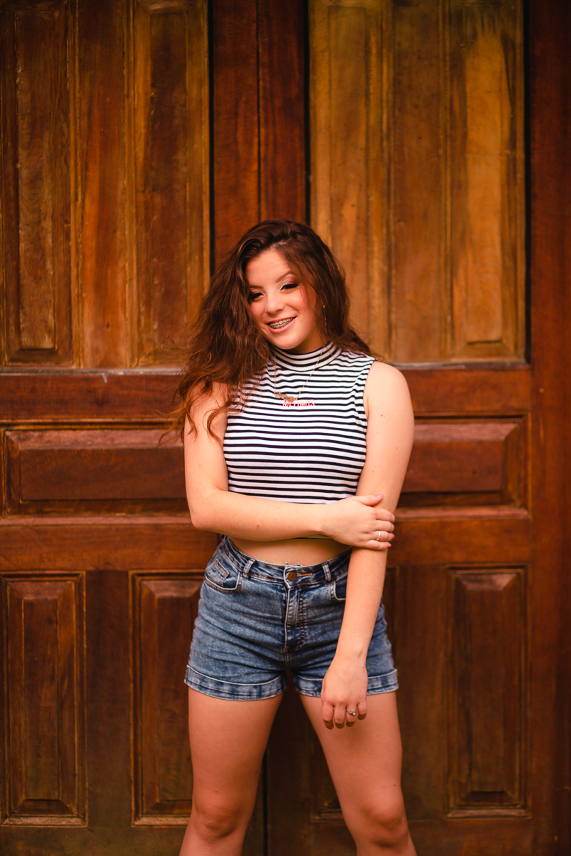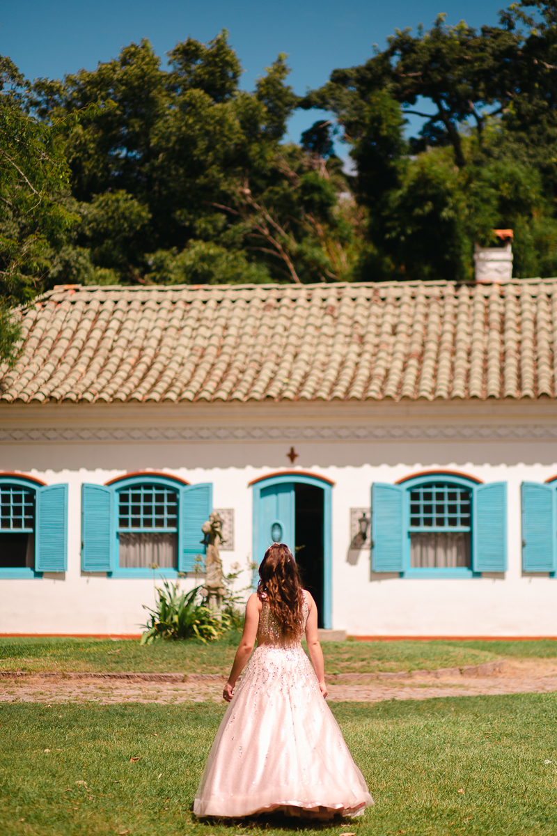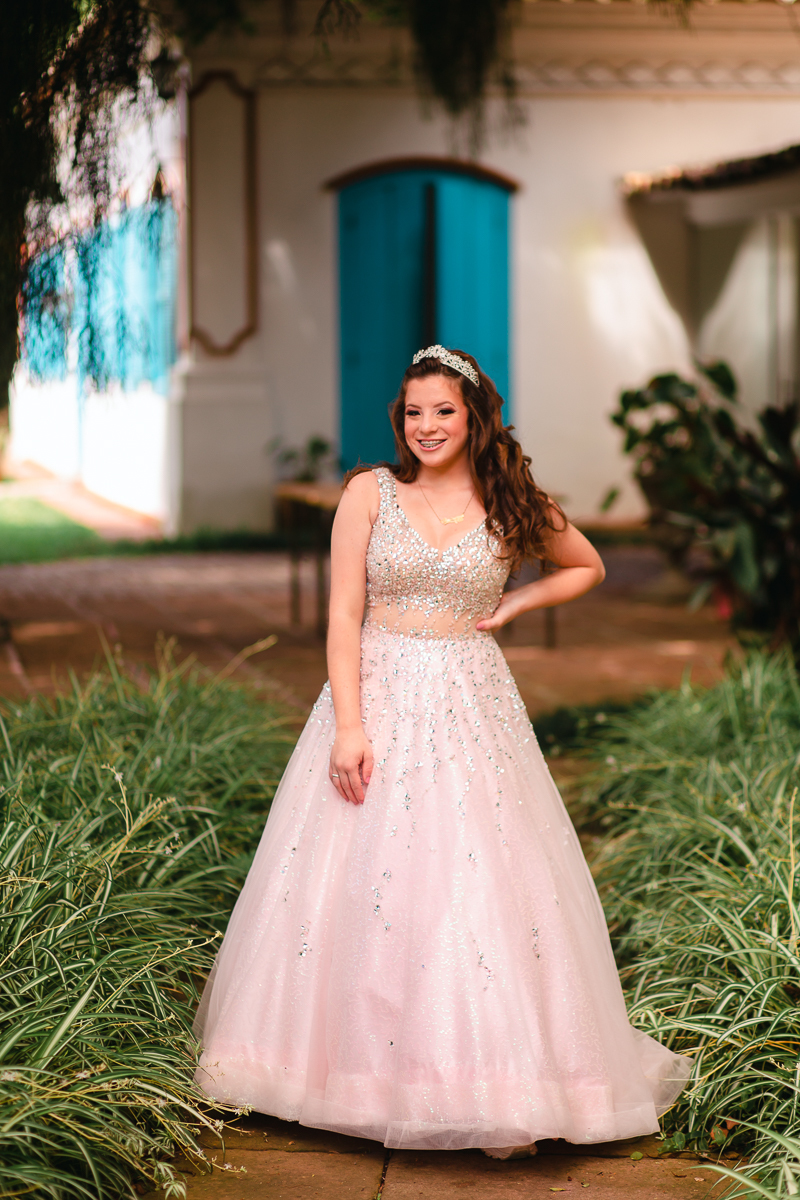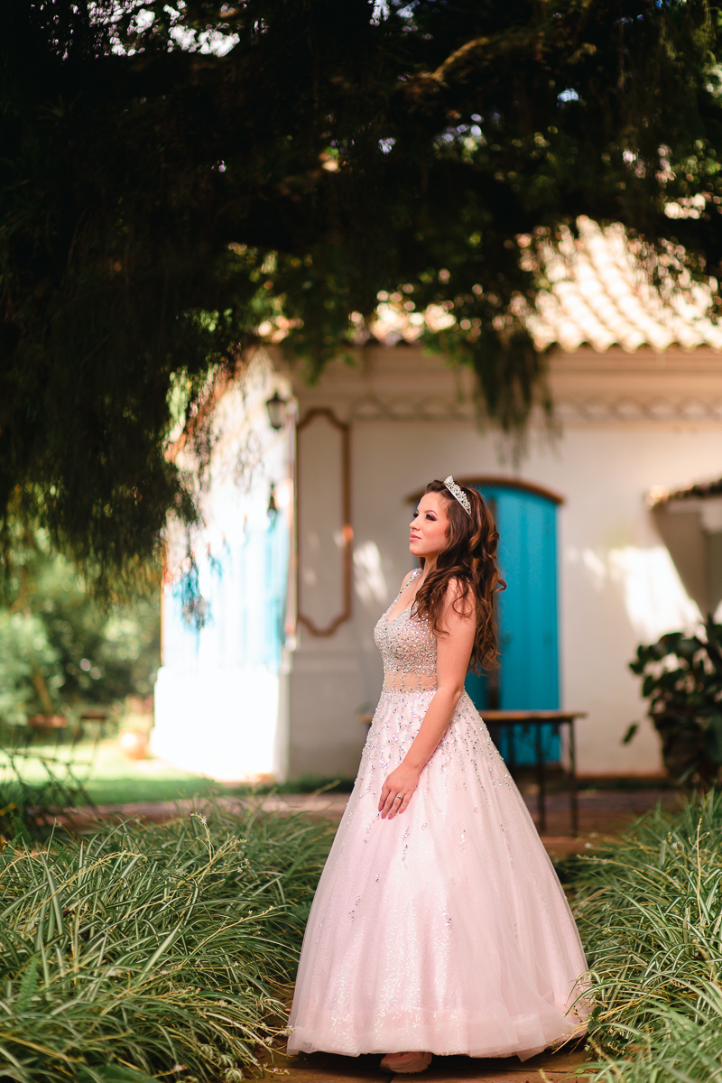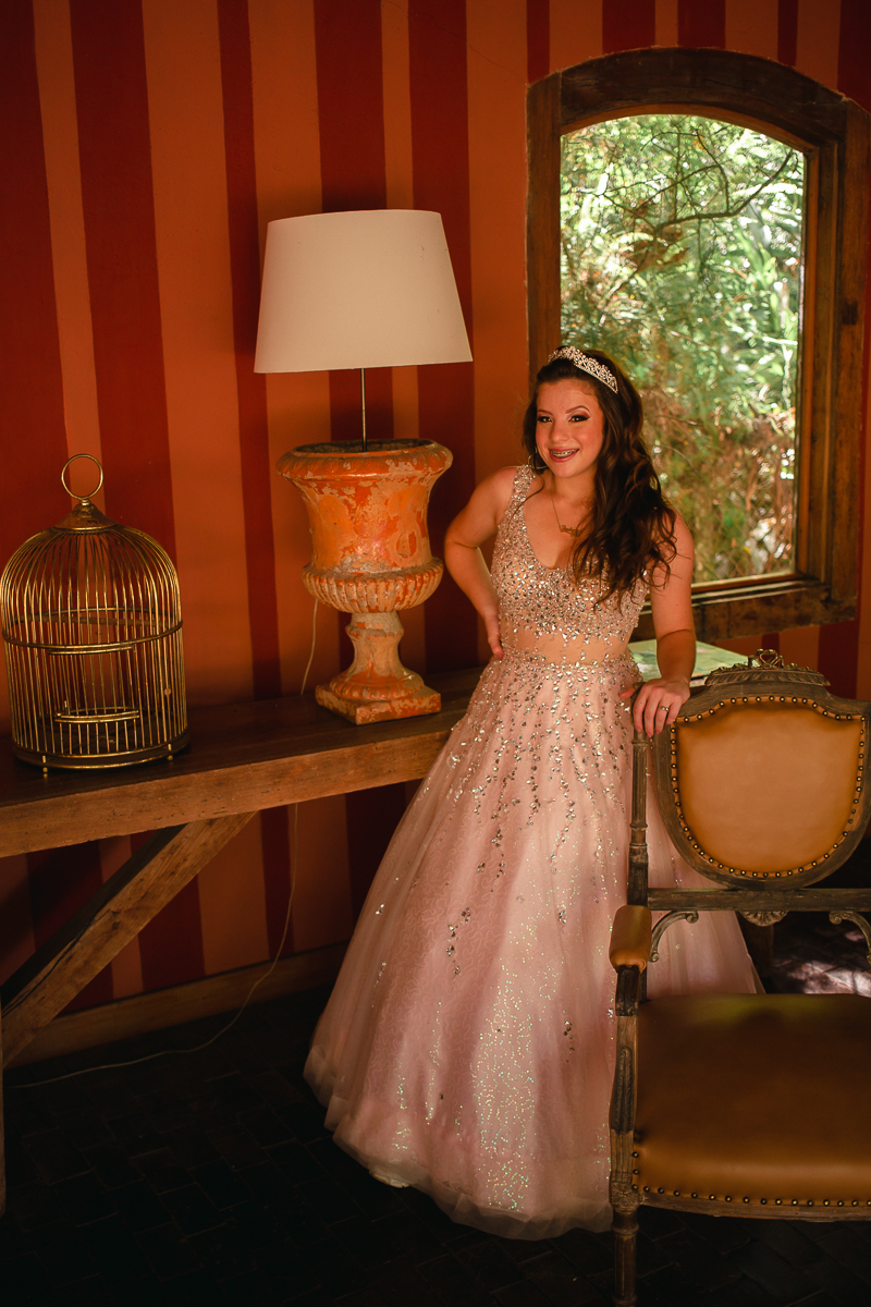 Desde o primeiro contato, sempre mencionou a sua vontade em fazer as fotos de vestido, o qual foi escolhido a dedo, muito brilhante, do jeito que ela queria. O local escolhido era perfeito: rústico e com muita natureza em volta pra dar ênfase ao look principal. Dei muita importância a isso, e depois fomos pra parte do ensaio onde os looks são mais o dia-a-dia da debutante.